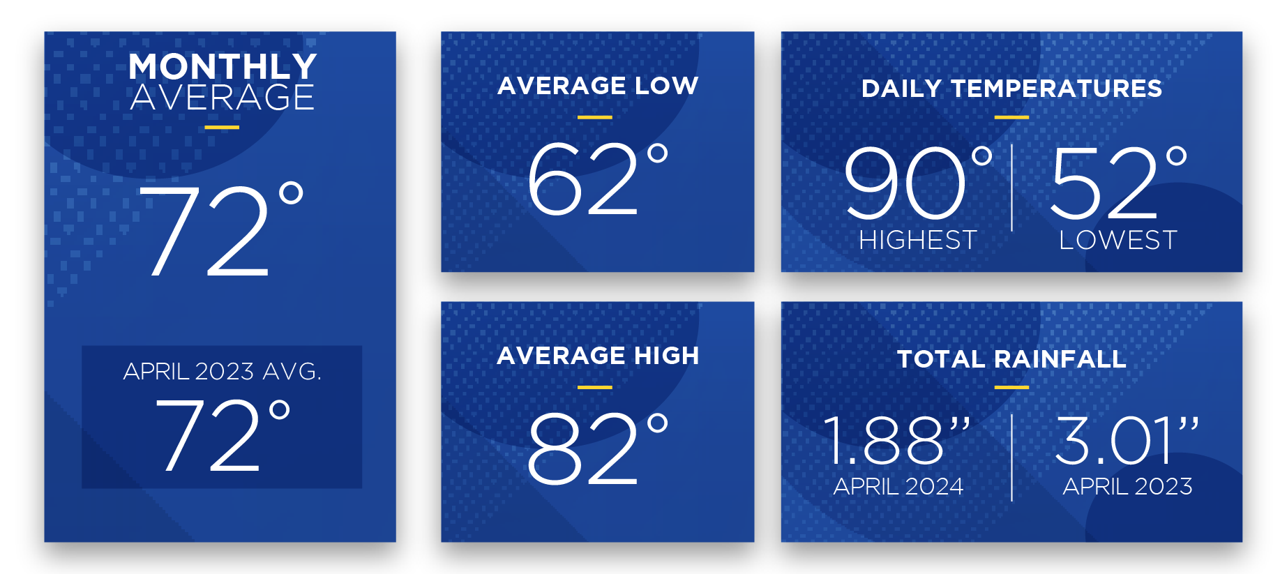 In April 2024, the average high and low temperatures continued to rise from last month as the arrival of warmer weather prevailed in Central Florida. The month’s average high temperature was 82 degrees, and the average low was 62 degrees, both measurements are 2 degrees lower than the “normal” averages as recorded at Leesburg International Airport (KLEE). The month’s highest temperature peaked at 90 degrees on the 19th and the lowest temperature was recorded on the 14th, when the mercury fell to 52 degrees.