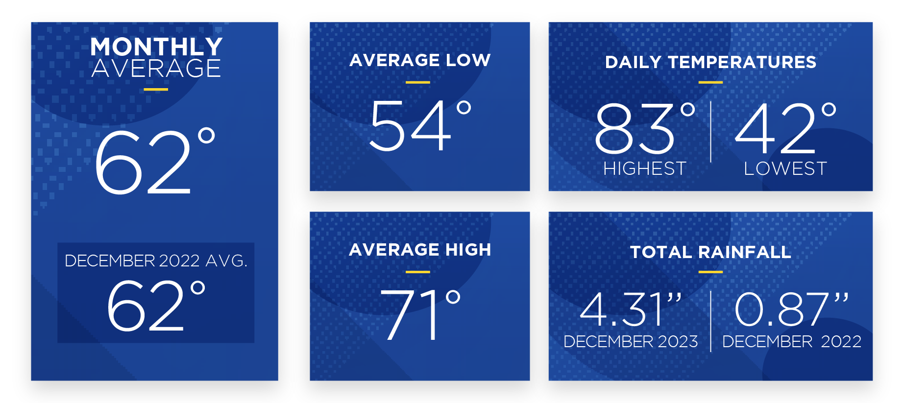 In December 2023, the monthly average high and low temperatures continued to drop as winter arrived on December 21. The average high temperature of 71 degrees fell 5 degrees from November’s 76-degree average, while the average low temperature of 54 degrees was 4 degrees lower than the November average low. The 62-degree overall average temperature for the month also dropped by 5 degrees from the November average.