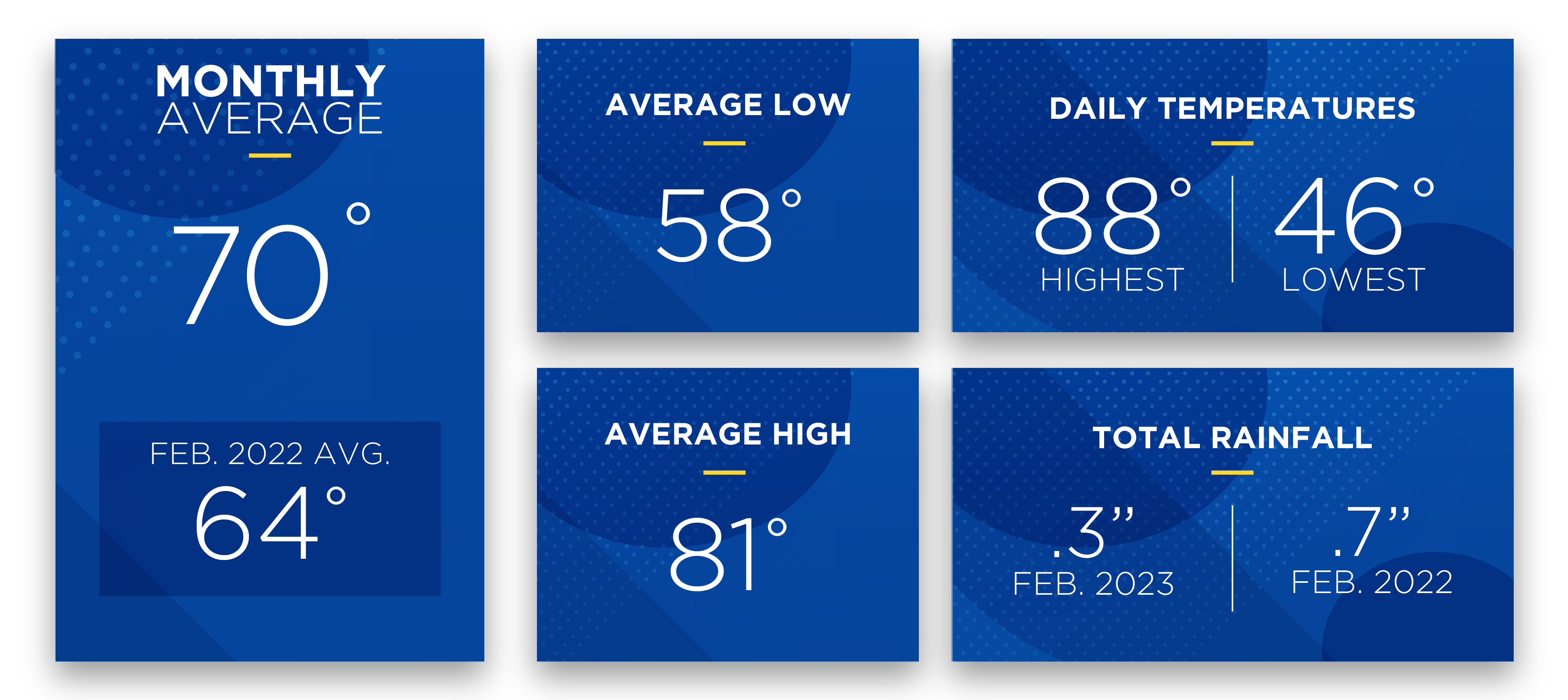 Expect spring temperatures to reach into the 80s most days in March 2023 with the possibility of a slight mid-month cool down when lows will reach into the 40s and 50s. The best chance for rain is in the middle of the month.