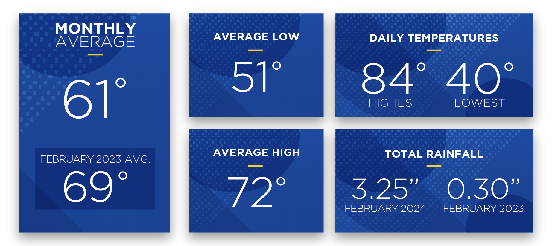 February recorded its highest temperature of 84 degrees on the 11th and the lowest daily recorded temperature occurred on the 22nd, when the mercury bottomed out at 40 degrees.