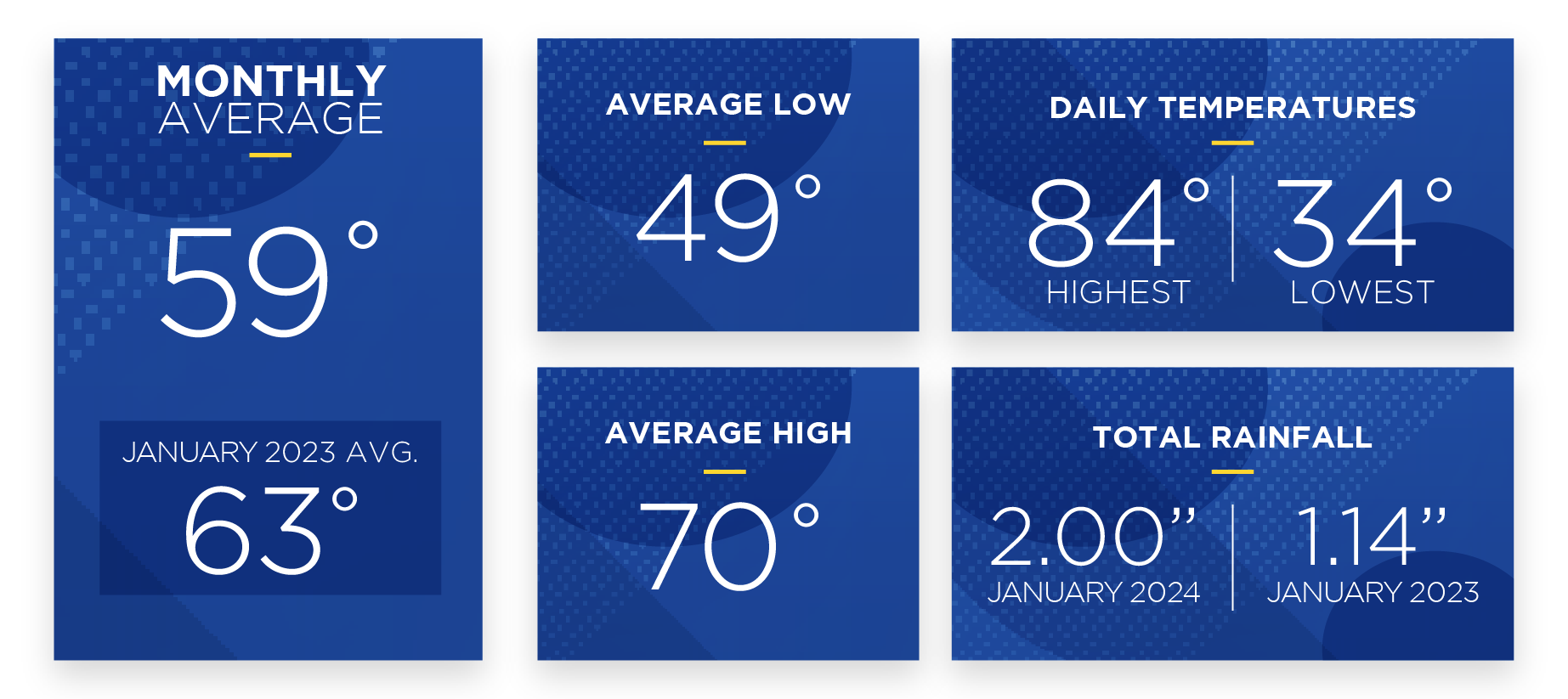 The month of January recorded its highest temperature of 84 degrees on the 27th and the lowest daily recorded temperature occurred on the 21st, when the mercury bottomed at 34 degrees.