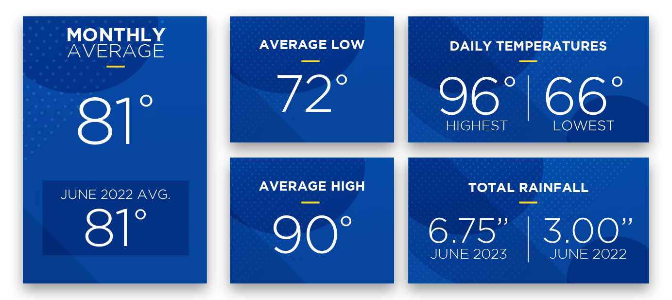 In June 2023, temperatures and rainfall moved upward from May as summer arrived with days of intense heat and heavy precipitation. The rainfall total for the month was 6.75 inches, which was an increase of 3.25 inches over May’s tally, and over twice the amount measured one year ago. June featured an increased pattern of afternoon thunderstorms, and Tropical Storms Arlene, Bret and Cindy formed but none had a significant impact on Central Florida.