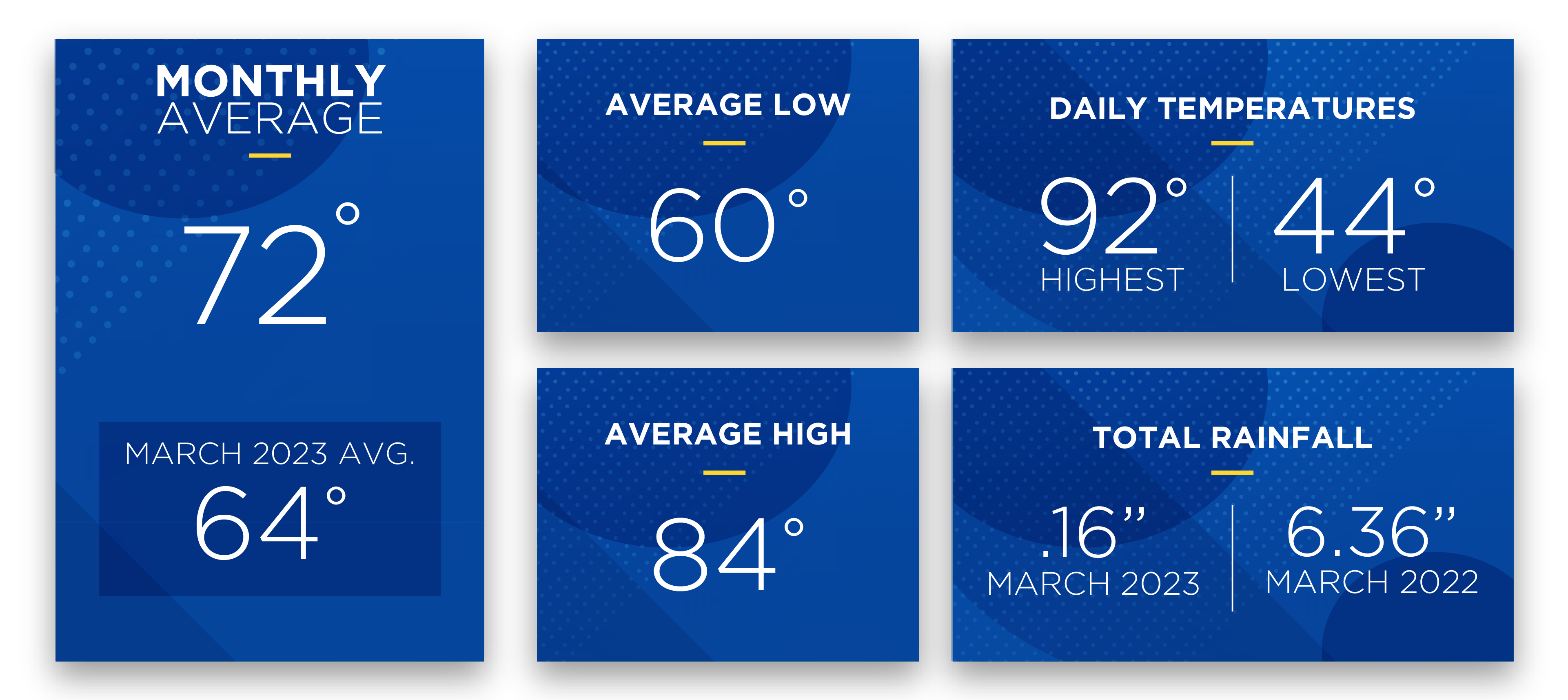Spring arrived in March 2023. While daily high temperatures increased during the month, cold temperatures continued as well. High daily temperatures ranged between the mid 60s and low 90s. Low daily temperatures dipped into the 40s.