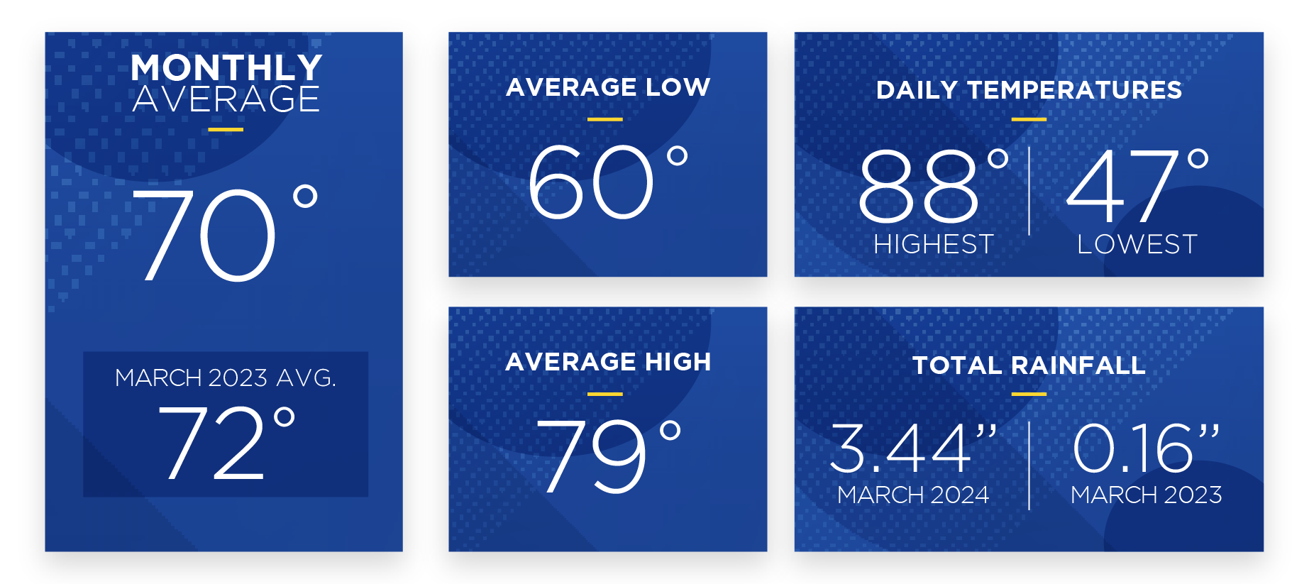 March recorded its highest temperature of 88 degrees on the 9th. The lowest daily recorded temperature of 47 degrees was on the 20th, one day after the lowest measured high temp of 67 degrees.