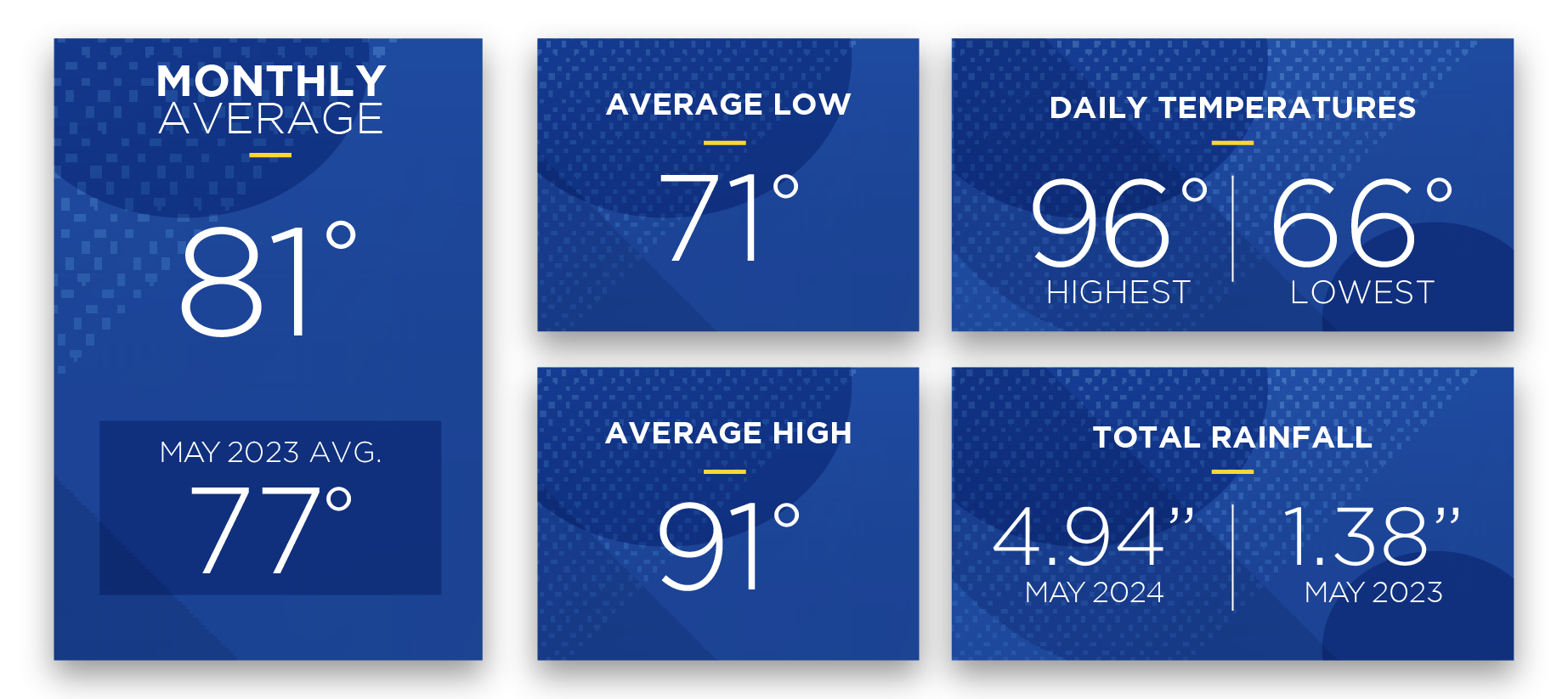 In May 2024, the average high and low temperatures rose 9 degrees from last month while rainfall and thunderstorm activity increased substantially across Central Florida. The month’s average high temperature was 91 degrees, and the average low was 71 degrees, measurements that were 3 and 2 degrees higher, respectively, than the “normal” averages as recorded at Leesburg International Airport (KLEE). The month’s highest temperature reached 96 degrees on the 29th and the lowest temperature was recorded on the 1st and 21st, when the mercury fell to 66 degrees.