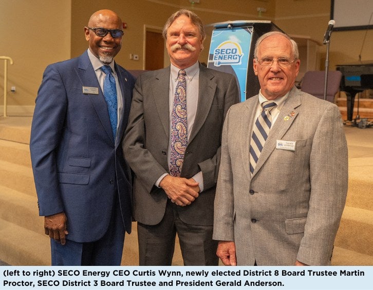 After the meeting, Mr. Proctor was congratulated by Board Trustee and President Gerald Anderson and SECO Energy CEO Curtis Wynn. Proctor is grateful for the opportunity to serve his community in a new capacity, stating, “I want to thank my fellow District 8 friends and neighbors who attended the meeting and election. I am grateful for the opportunity to serve on the SECO Energy Board of Trustees and expect to learn as much about the cooperative and industry as possible. Mr. James has served this District well; he mentored me and nominated me to the SECO Energy Foundation Board. This new role will increase my knowledge of the energy industry and cooperative, not-for-profit business model. I am excited for the challenge and the ability to work with and build communication with my future Board peers.”
