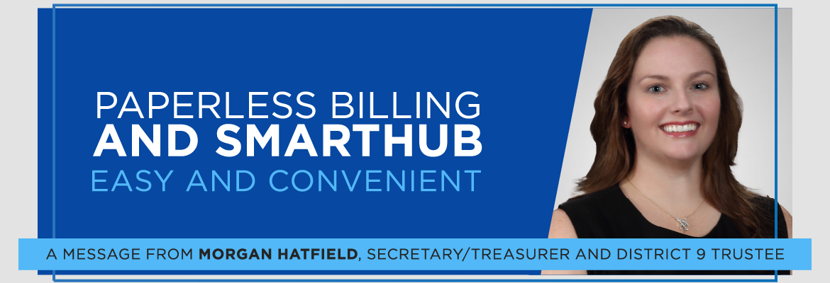 To enroll in paperless billing, log in to your SmartHub account, choose Settings and Paperless Billing. Set the toggle switch to “ON” for “Go Paperless.”